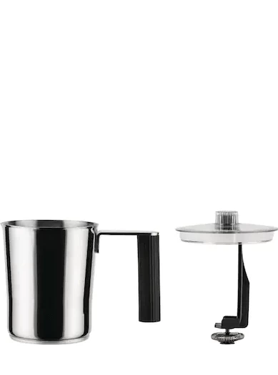 De zwarte Alessi Plissé elektrische melkopschuimer is gemaakt van een roestvrij stalen beker met een voetstuk van kunststof. De melkopschuimer klopt melk op door middel van een magneet in de motor, die de garde aan de deksel aandrijft. De melkopschuimer heeft een inhoud van 350 ml. Gebruik de schuimer om melk voor verschillende koffiebereidingen op te schuimen te verwarmen.