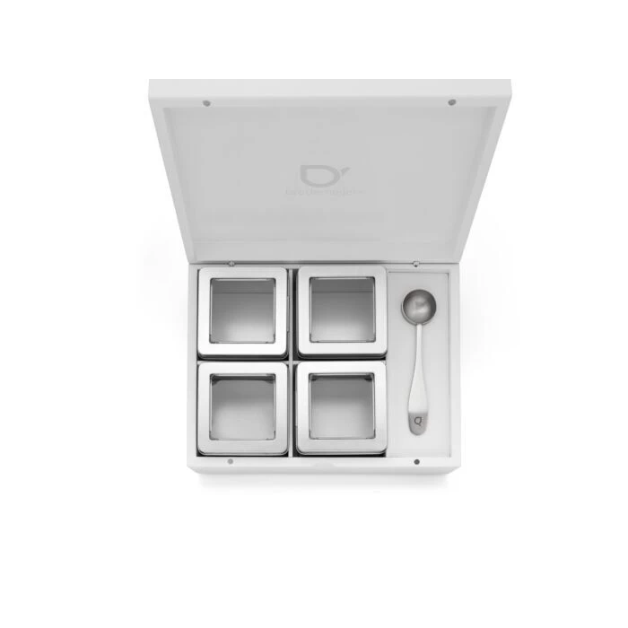 De theedoos van Bredemeijer is gemaakt van wit bamboe. De kist heeft een compacte afmeting. Het kistje wordt geleverd met vier blikjes en een theemaatlepel voor het bewaren, serveren en presenteren van losse thee.
