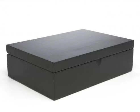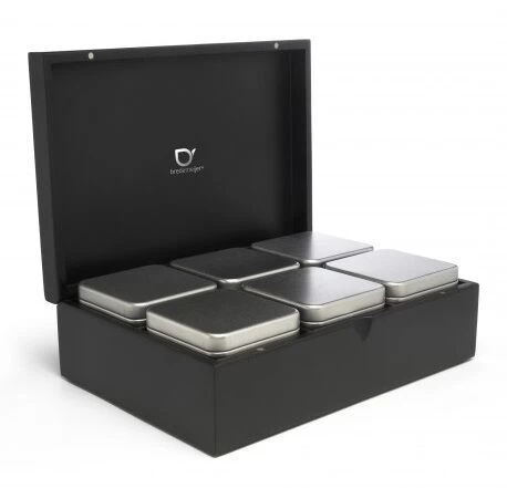 De theedoos van Bredemeijer is gemaakt van zwart bamboe. De kist heeft een compacte afmeting. Het kistje wordt geleverd met zes blikjes voor het bewaren en presenteren van losse thee.