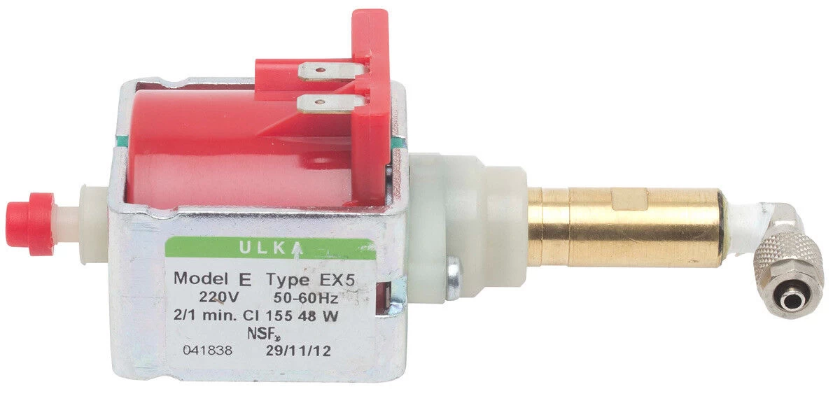 De Ulka vibratiepomp model E, type EX5 wordt gebruikt in diverse espressomachines. De pomp produceert een gemiddelde druk van 15 bar en heeft een pompcapaciteit van 650 ml per minuut. De koppeling aan de ingang heeft zaagtandprofiel met een diameter 7,5 mm. De messing uitgangskoppeling is voorzien van een inwendige schroefdraad en heeft een diameter van 9 mm. Het onderdeel wordt geleverd met een fitting voor een teflonslang. Gebruik het onderdeel om een oude pomp te vervangen.
